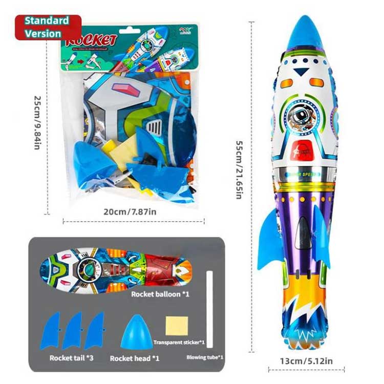 Ang packaging tungkol sa 3D rocket foil balloon throwing inflatable ay isang malinis at maayos na cardboard bag, na ginagawang maganda kung ikaw mismo ang gumamit nito o iregalo. Kumpleto rin ang mga accessory sa loob: 1 rocket balloon body, 3 rocket legs, 1 rocket head, at 1 straw o air pump (iyong napili), at 4 na sticker sheet.