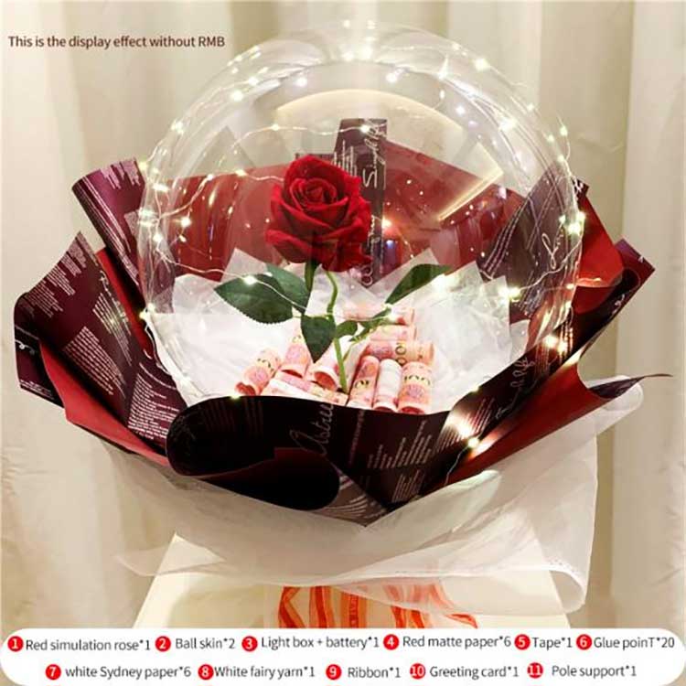 Sukat:Ang high-end na bersyon tungkol sa 50 cm ang haba na may 35 cm ang haba ng stick; ang mid-range at karaniwang bersyon ay gumagamit ng 70 cm ang haba na stick na may kabuuang sukat na humigit-kumulang 80 cm. Ang high-end na bersyon ay may kasamang higit paaccessories:3 layer ng tissue paper 3 layer ng floral wrapping paper 1 layer ng gauze. Kasama sa mid-range na bersyon ang: 1 layer ng tissue paper 1 layer ng wrapping paper 1 layer ng gauze. Ang karaniwang bersyonkasama ang:1 layer na gauze na hugis pusong BOBO balloon.