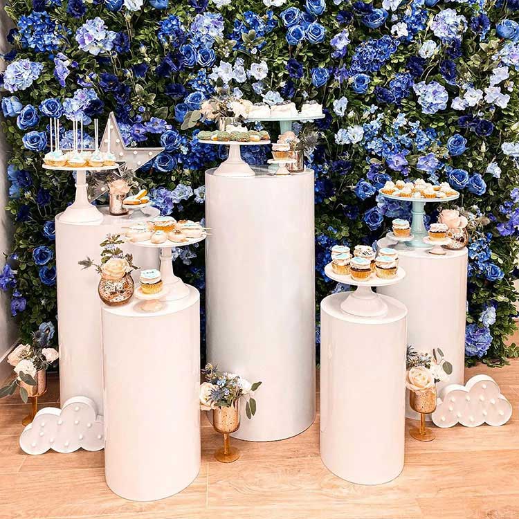 Ang cylindrical base dessert table ay nagsisilbing lalagyan at palamuti. Kadalasan, may iba't ibang kumbinasyon ang mga ito: kumbinasyon ng 3 piraso, kumbinasyon ng 5 piraso, kumbinasyon ng 7 piraso, at iba pa. Ang pinakakaraniwang kumbinasyon ay limang piraso. Ang mga independiyenteng cylindrical na tubo na may iba't ibang laki ay maaaring madaling ayusin, at ang mga ito ay isang mahalagang bahagi ng eksena. Kasabay nito, nag-aalok din kami ng pagpapasadya para sa laki at hugis. Higit pa, tumutugma ang mga ito sa iyong mga dekorasyon sa partido.