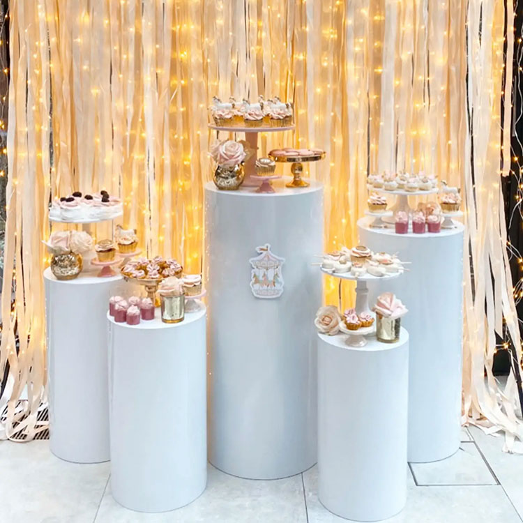 Maaaring gamitin ang cylindrical dessert table sa mga party, kasalan, birthday event, at maaari ding gamitin ng mga negosyo ang mga ito para magpakita ng mga artwork, bulaklak, alahas, at iba pa.