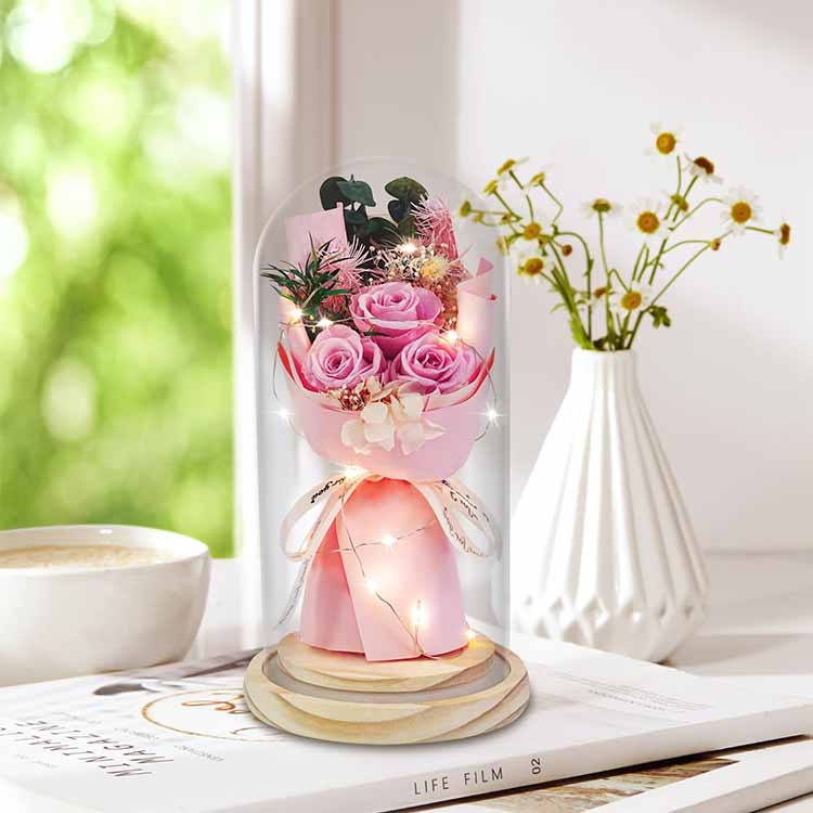 Ang salamin na simboryo ng sabon na rosas na palumpon na may LED ay ginagamit kasabay ng mga bulaklak ng sabon at napanatili na mga bulaklak.led lights Gumamit ng mainit at hindi glaring light, na maaaring magdagdag ng isang mainit na kapaligiran kapag ang mga dekorasyon ng mga eksena. Bilang isang regalo.Everlasting Flowers ay hindi malalanta at hindi magbabago ng kulay kahit na may isang takip na baso. Ang mga bulaklak ng sabon ay maaari ding magamit upang hugasan ang mga kamay o bilang halimuyak.Ang rosas na palumpon ay matipid at praktikal.