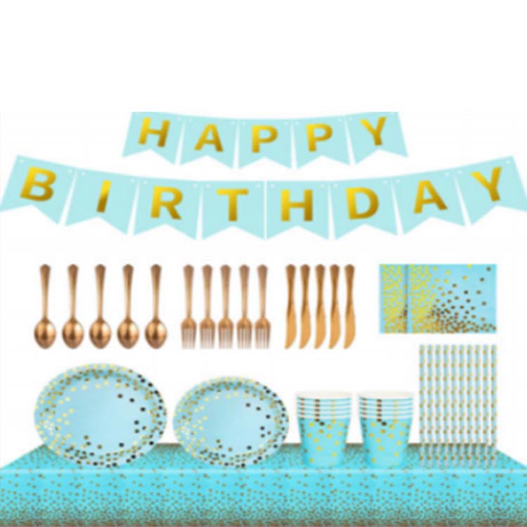 Materyal: Ang set ng tableware ng partido ay gawa sa berde at kapaligiran friendly na mga materyales, na may mahusay na mga tampok sa kaligtasan. Maaari itong epektibong maiwasan ang mga gasgas na dulot ng mga patak at protektahan ang mga tao mula sa hindi sinasadyang mga banggaan habang ginagamit. Ang matikas na gintong embossing ay lumilikha ng isang magandang visual na epekto at karagdagang pagpapahusay ng pandekorasyon na halaga nito.