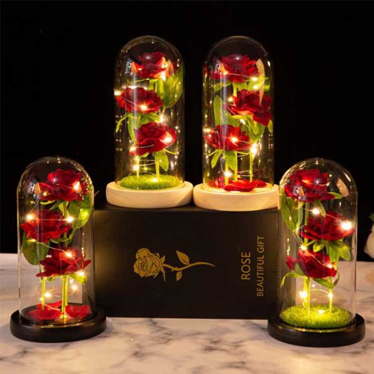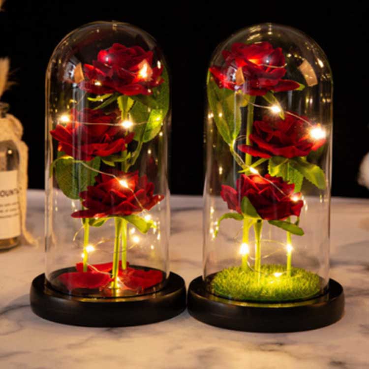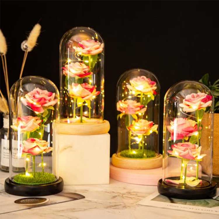 Sa loob ng rosas na simboryo ng baso ay tatlong napanatili na bulaklak na nakalagay sa iba't ibang taas, na may makatotohanang mga tangkay at berdeng dahon.Ang takip ng baso ay lumalaban sa init at hindi madaling masira.Ang mga ilaw ng LED string ay may built-in na malambot na pag-iilaw, at ang switch ay matatagpuan sa ilalim ng kahoy na base para sa madaling operasyon.