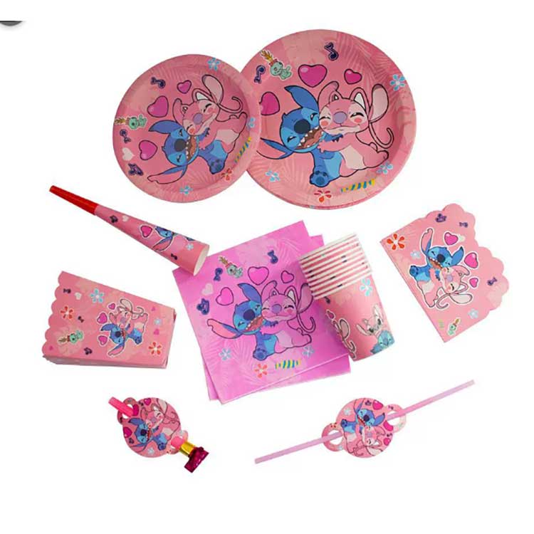 Kasama sa Stitch disposable plate set ang mga sumusunod na produkto: 7-inch plates (10pcs/bag), 9-inch plates (10pcs/bag), napkins (20pcs/bag), pennants (10pcs/bag), return gift bags (10pcs/bag), popcorn boxes (6pcs/bag), blowing dragons (6pcs/bag), paper hats (6pcs/bag), (6pcs/bag) (6pcs/bag), straw (10pcs/bag), invitation card (10pcs/bag), masks (10pcs/bag), kutsara, kubyertos (10pcs/bag), at tablecloth (1pc/bag). Ang set ay naglalaman ng 17 iba't ibang uri ng produkto. Maaaring piliin ng mga customer na bilhin ang buong set o pumili lamang ng isang bahagi ng mga item upang matugunan ang kanilang mga pangangailangan.